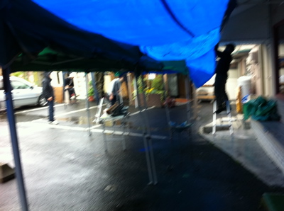 雨、降っても駐車場にタープ張ってやりまっせ!!