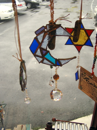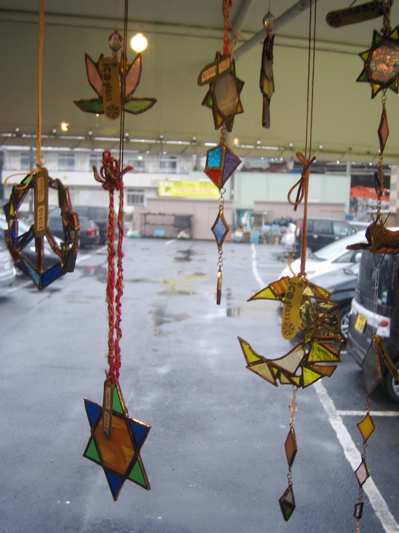 店の窓ガラス一面にico-glassのオーナメントがいっぱいです。