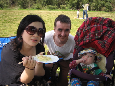 みんなで持ち寄った料理を青空の中おいしく頂き、