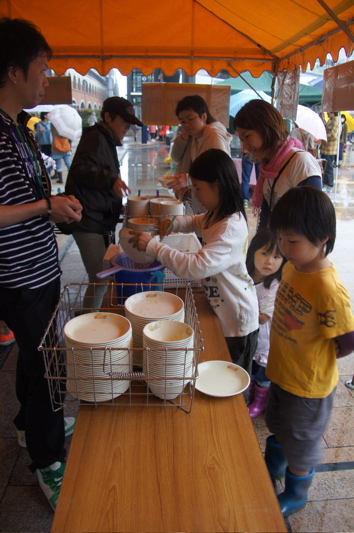 マイ食器で食事。2Fでは50店の物販ブースが並ぶ